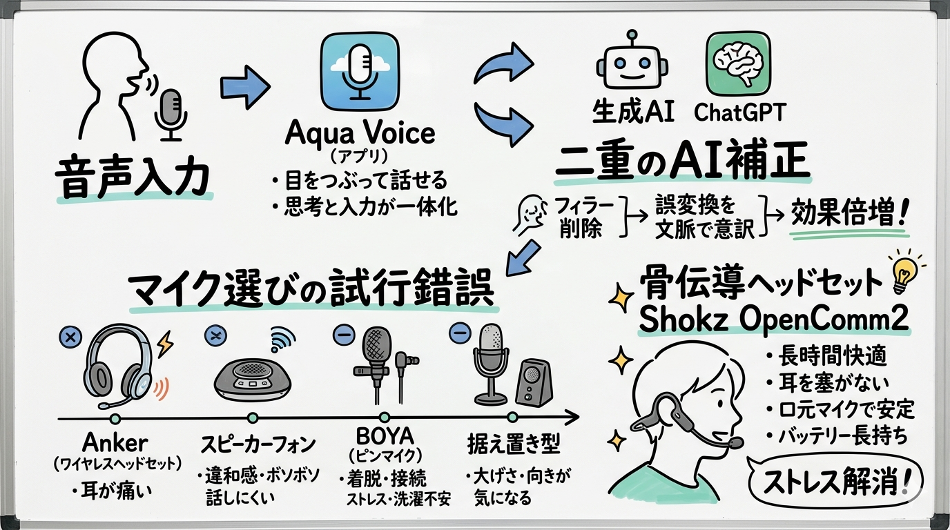 Aqua Voiceと生成AIの二重活用で音声入力が劇的に快適になった体験と、ヘッドセット・ピンマイク・骨伝導と試行錯誤したマイク選びの記録。